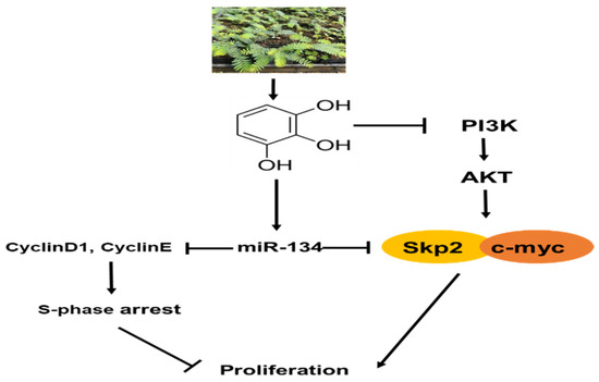 Molecular mechanisms of Pyrogallol via miR-134 activation mediated S-phase arrest and inhibition of the P13K/AKT/SKP2 and cMyc signaling axis.