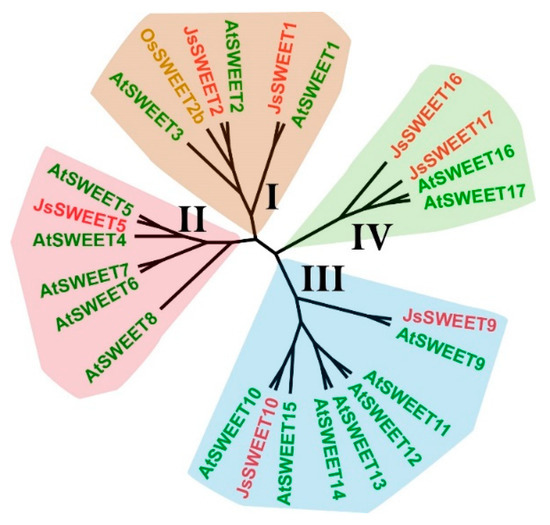 Sequence analysis revealed that these proteins represent all the four clades of the SWEET family (Figure 2 and Figure S1). Accordingly, we renamed the full-length cDNA to JsSWEET1 (c50045_g1), JsSWEER2 (c60775_g2), JsSWEET5 (c41111_g1), JsSWEET9 (c51507_g1), JsSWEET10 (c44769_g1), JsSWEET16 (c51046_g2), and JsSWEET17 (c42726_g1), respectively. JsSWEET1 shares 71.37% amino acid identity with its arabidopsis orthodox AtSWEET1, followed by JsSWEET5 with 62.87% to AtSWEET5. The JsSWEET2 is more closely related to AtSWEET2 (60.43%) than to OsSWEET2b (53.95%) (Table S4).