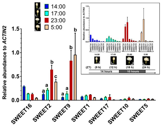 2.2. Expression of the SWEET Genes during Flower Opening Stages