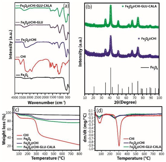 - Ziegler-Borowska, M.; Chełminiak, D.; Kaczmarek, H. Thermal stability of magnetic nanoparticles coated by blends of modified chitosan and poly(quaternary ammonium) salt. J. Therm. Anal. Calorim. 2015, 119, 499–506. [Google Scholar] [CrossRef]