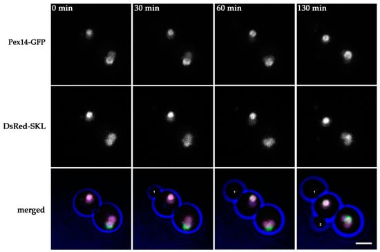 Peroxisome fission and inheritance in H. polymorpha pex11. Stills from a CLSM video (Supplementary Data S1) representing budding pex11 cells producing Pex14-GFP and DsRed-SKL. Blue represents cell edges. Arrows point to Pex14-GFP containing spots that separate from a mother organelle during yeast budding and are transferred to a forming daughter cell. Images were acquired with 5 min time intervals. Scale bar represents 2 µm.