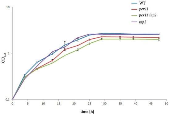 Because peroxisome-deficient H. polymorpha cells are unable to grow on methanol, we expected that the presence of a significant portion of cells (temporarily) lacking peroxisomes will affect growth of the cells in batch cultures containing methanol. As shown in Figure 6, pex11 cultures showed enhanced doubling times and the final density of the culture was lower in comparison to the WT, in accordance to earlier data []. These effects were slightly stronger in the pex11 inp2 double mutant. However, no differences in growth characteristics were observed between WT and the inp2 single mutant. This result was surprising as we expected the inp2 mutant to grow with rates comparable to pex11, given the similar percentages of cells without peroxisomes (see Figure 4).