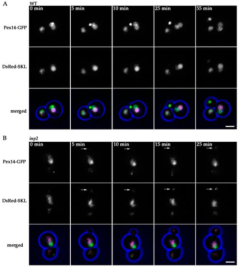 Peroxisome inheritance in H. polymorpha WT and inp2 cells. Stills from a CLSM video representing budding (A) WT (Supplementary Data S4) and (B) inp2 cells (Supplementary Data S3), producing Pex14-GFP and DsRed-SKL. Blue represents cell edges. Images were acquired with 5 min time intervals. Arrows in (B) point to fluorescent spots that were transferred from a mother organelle to a forming daughter cell during yeast budding. Scale bar represents 2 µm.