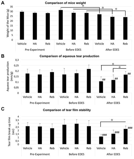 Weight of the mice, aqueous tear production and tear film stability measurement. (A) The mean weight decreased significantly in all groups after exposure to EDES. (B) A marked decrease in aqueous tear quantity can be seen in all groups after EDES exposure for three days (p < 0.0001). After EDES exposure, aqueous tear quantity in the rebamipide group (Reb) was significantly higher than that in the vehicle (p = 0.013) and HA groups (p = 0.022). (C) The mean TBUT decreased significantly with EDES exposure in all groups (# p < 0.0001). Following EDES exposure, the mean TBUT in the rebamipide group was significantly longer than that in the vehicle group (p = 0.0019). # represents comparison between time points (# p < 0.05, ## p < 0.001, ### p < 0.0001) and * represents comparison between treatment groups (* p < 0.05, ** p < 0.001, *** p < 0.0001).