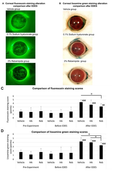 Representative anterior segment photographs and comparison of corneal fluorescein and lissamine green staining scores in 0.1% HA and 2% rebamipide instillation groups. Representative post-EDES fluorescein (A) and lissamine green (B) staining photographs show denser staining in the vehicle than HA and rebamipide groups. (C) The mean fluorescein staining score in all groups significantly increased after EDES exposure (p < 0.0001). Please note a significant impairment of the fluorescein staining scores in the vehicle group compared to the rebamipide group after EDES exposure (p = 0.006). (D) The mean lissamine green staining score in all groups significantly increased after EDES exposure (p < 0.0001). Please note a significant impairment of lissamine green staining scores in the vehicle (p = 0.007) and HA groups (p = 0.025) compared to the rebamipide group after EDES exposure. # represents comparison between time points (# p < 0.05, ## p < 0.001, ### p < 0.0001) and * represents comparison between treatment groups (* p < 0.05, ** p < 0.001, *** p < 0.0001).