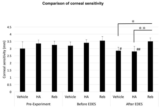 Quantitative analysis of corneal sensitivity. Please note the significant decrease in corneal sensitivity in the vehicle (p = 0.014) and HA groups (p = 0.0009) after EDES exposure. After exposure to EDES, corneal sensitivity in the rebamipide group (Reb) was significantly higher than that in the vehicle (p = 0.003) and HA groups (p = 0.007). # represents comparison between time points (# p < 0.05, ## p < 0.001, ### p < 0.0001) and * represents comparison between treatment groups (* p < 0.05, ** p < 0.001, *** p < 0.0001).