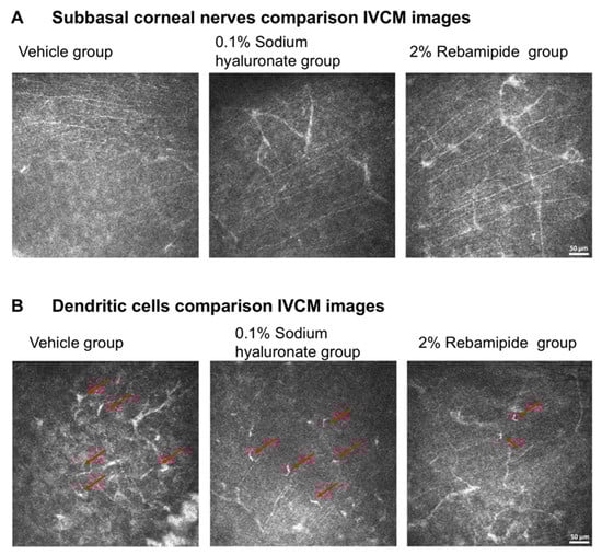 Other morphological parameters that have been commonly evaluated with CSN include tortuosity, reflexivity, budding patterns, and DC density [,,,,,]. Previous studies have shown that the aforementioned parameters are worse in dry eye patients, possibly due to neural regeneration after damage to the subbasal corneal nerves. In patients with DED, an increase in the intensity of DCs and other immunocytes was also detected using IVCM [,,,,] and could be correlated with their clinical symptoms []. Therefore, IVCM is considered a significant diagnostic method that can aid in the diagnosis and treatment of DED. In this study, we compared the effect of rebamipide eye drops with vehicle and HA eye drops on DC density after a seven-day experimental procedure. We demonstrated a notable reduction in DC density with topical rebamipide eye drop instillation compared to vehicle and HA eye drop instillations. A previous study by Arakaki et al., (2014) showed that topical rebamipide application decreased inflammation in ocular autoimmune lesions in a murine model of Sjögren’s syndrome and had a protective effect on the ocular surface []. Additionally, Ueta et al., (2013) demonstrated that the topical instillation of rebamipide on the ocular surface may reduce ocular surface inflammation by decreasing the release of cytokines by the epithelial cells in this region, which is compatible with the results of our study []. It remains unclear how ocular surface inflammation affects the subbasal nerve changes in our mouse model. Local inflammation and peripheral nerve damage can occur due to stress in the ocular mucosal epithelium in association with reduced tear production and increased osmolarity []. Moreover, local inflammation and nerve damage could cause short- and long-term genetic and molecular alterations in the primary sensory neurons []. On the other hand, a previous study has suggested that corneal subbasal nerves have a potential role in neuroprotection [].
