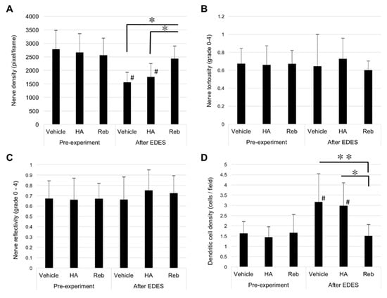 Quantitative analysis of in vivo confocal microscopy images for nerve density, tortuosity, reflectivity, and DC density. (A) A significant reduction of nerve density was observed in the vehicle and HA groups after exposure to EDES (both groups; p < 0.0001). The corneal nerve density in the rebamipide group (Reb) was significantly higher than the vehicle (p = 0.004) and HA groups (p = 0.007). (B) There were no significant differences in nerve tortuosity between time points (p = 0.944) or treatments (p = 0.759). (C) There were also no significant differences in nerve reflectivity between time points (p = 0.539) and treatments (p = 0.903). (D) The DC density in the vehicle and HA groups significantly increased after exposure to EDES (vehicle group, p = 0.002; HA group, p = 0.004). The DC density in the rebamipide group was lower than the vehicle (p = 0.0004) and HA (* p = 0.006) groups. # represents comparison between time points (# p < 0.05, ## p < 0.001, ### p < 0.0001) and * represents comparison between treatment groups (* p < 0.05, ** p < 0.001, *** p < 0.0001).