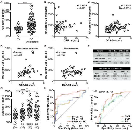 2.1. Gal-9 Is Elevated in Serum of RA Patients and Correlates with Certain Clinical Parameters