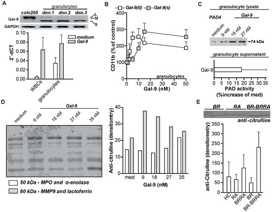 Wiersma, V.R.; Clarke, A.; Pouwels, S.D.; Perry, E.; Abdullah, T.M.; Kelly, C.; Soyza, A.D.; Hutchinson, D.; Eggleton, P.; Bremer, E. Galectin-9 Is a Possible Promoter of Immunopathology in Rheumatoid Arthritis by Activation of Peptidyl Arginine Deiminase 4 (PAD-4) in Granulocytes. Int. J. Mol. Sci. 2019, 20, 4046. https://doi.org/10.3390/ijms20164046