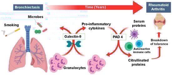 - Quirke, A.-M.; Perry, E.; Cartwright, A.; Kelly, C.; De Soyza, A.; Eggleton, P.; Hutchinson, D.; Venables, P.J. Bronchiectasis is a model for chronic bacterial infection inducing autoimmunity in rheumatoid arthritis. Arthritis Rheumatol. 2015, 67, 2335–2342. [Google Scholar] [CrossRef] [PubMed]