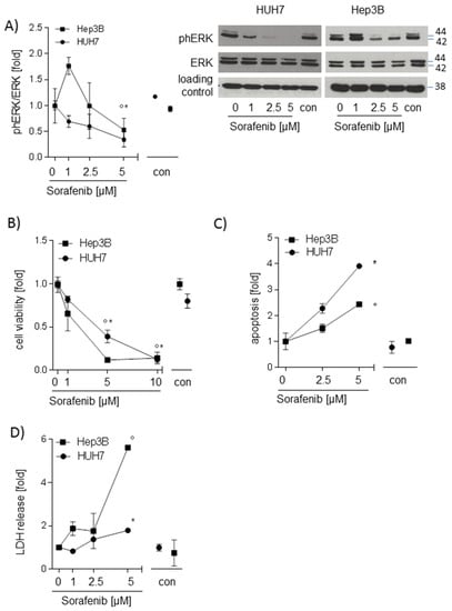 To check whether sorafenib is active in the hepatocarcinoma cell lines used in this study, HUH7, Hep3B, and HepG2 cells were stimulated with different concentrations of sorafenib ranging from 0 to 10 µM for 24 h. Phosphorylation of extracellular signal regulated kinase (ERK), a downstream target of rapidly accelerated fibrosarcoma (RAF), cell viability, apoptosis, and lactate dehydrogenase (LDH) release were analyzed. Phosphorylation of ERK was decreased (p < 0.05 in Hep3B and HUH7 cells) after stimulation with 5 µM sorafenib (Figure 1A). Sorafenib (5 µM and 10 µM) reduced cell viability in both HUH7 and Hep3B (Figure 1B). With a maximum dose of 5 µM sorafenib, apoptotic cell number (p < 0.05, Figure 1C) and LDH release (p < 0.05, Figure 1D) was significantly increased in Hep3B and in HUH7 cells. The same results were seen in HepG2 cells (Supplement Figure S1A,B), indicating that sorafenib is active and promoting cell death.