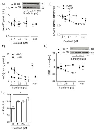 Sorafenib-induced decrease of nicotinamide adenine dinucleotide (NAD) levels in hepatocarcinoma cells is not mediated by nicotinamide phosphoribosyltransferase (NAMPT) or sirtuin (SIRT1) NAMPT (A), and SIRT1 (D) protein were analyzed by Western blot analysis. NAMPT and SIRT1 protein were normalized to glyceraldehyde-3-phosphate dehydrogenase (GAPDH) (not shown). One representative blot out of three experiments is shown as an insert. Densitometric analysis was performed to semi-quantify values (n = 3). (B) Intracellular NAMPT enzyme activity was determined by measuring the conversion of 14C-labeled nicotinamide to 14C-NMN (n = 3). (C) Intracellular NAD levels were measured by gradient HPLC/UV analysis (n = 3). (E) Expression of miRNA34a was measured using miScript primer assays for miR34a-1 and normalized to Hs_RNU6_2_1 (n = 3). For all experiments, HUH7 and Hep3B cells were stimulated with sorafenib (1 µM; 2.5 µM, and 5 µM) for 24 h. The mean value of serum-free medium (0 µM) was used to normalize values of the respective datasets. Data are shown as mean ± SEM. con: solvent control (DMSO); ° p < 0.05 (HUH7); * p < 0.05 (Hep3B).