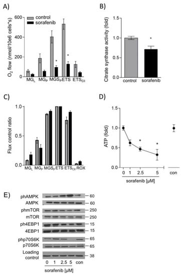 Sorafenib decreases respiration, adenosine triphosphate (ATP) levels and activation of the mechanistic target of rapamycin C1 (mTORC1) pathway in HUH7 cells. Mitochondrial respiration was measured after addition of substrates malate and glutamate (MGL), ADP (MGP), succinate (MGSP), uncoupling by carbonyl cyanide-4-(trifluoromethoxy)phenylhydrazone FCCP (ETS), complex I inhibitor rotenone (ETSII) and complex III inhibitor Antimycin A (ROX) by high resolution respirometry (Oxygraph2K, Oroboros, Austria) in (A) permeabilized HUH7 cells (1 µM sorafenib for 24 h) and (C) after direct addition of sorafenib (10 µM) to isolated mitochondria. Values are normalized to maximal O2 flux (uncoupling conditions). (B) Citrate synthase (CS) activity was determined by measuring the conversion of 5,5′-dithio-bis-(2-nitro-benzoic acid) (DNTB) 20 μg of protein were added to 200 μL reaction mix (Tris 20 mM pH 7.5, DTNB 0.1 mM, acetyl-CoA 0.3 mM) and blank absorbance at 412 nm was measured for 15 min at 30 °C. The reaction was started by adding oxaloacetate (0.5 mM), and measurement was continued for 15 min. Blank values were subtracted, and values were normalized to the mean of DMSO controls. (D) ATP levels were measured by CellTiter-Glo Luminescent Cell Viability Assay after stimulation with sorafenib (1 µM; 2.5 µM, and 5 µM) for 24 h. (E) One representative blot out of three experiments of ph-AMPK, ph-mTOR, ph-4EBP1, and ph-p70S6K is shown. Phosphorylated protein was normalized to total protein and loading control (GAPDH). The mean value of serum-free medium (0 µM) was used to normalize values of the respective datasets. Data are shown as mean ± SEM. con: solvent control (DMSO); * p < 0.05.
