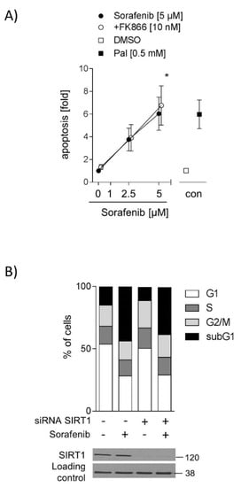 Inhibition of SIRT1 does not sensitize hepatocarcinoma cells to sorafenib (A) Cells were stimulated with sorafenib (2.5 µM and 5 µM) alone or in combination with FK866 (10 nM) for 24 h. Apoptosis was determined by FITC Annexin V Apoptosis Detection Kit and flow cytometry. Annexin V-FITC positive cells and Annexin-V-FITC and PI-positive cells were defined as apoptotic cells (n = 3). DMSO serves as solvent control and palmitate (0.5 mM) as a positive control. The mean value of serum-free medium (0 µM) was used to normalize values of the respective datasets. (B) SIRT1 protein levels were downregulated by SIRT1 siRNA using electroporation. Control cells were transfected with control siRNA. Cell cycle distribution was analyzed by PI staining to analyze DNA content. Data are shown as mean ± SEM. * p < 0.05.