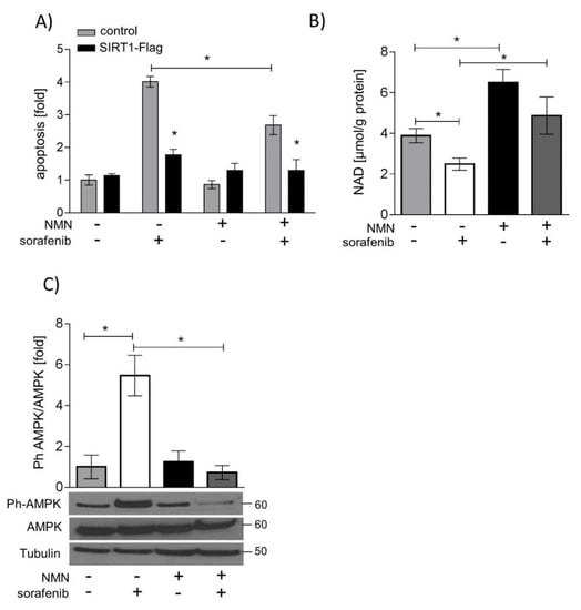 Vice versa, SIRT1 protein was overexpressed, or NAD levels were normalized by the NAMPT enzyme product nicotinamide mononucleotide (NMN). SIRT1 overexpression and supplementation with NMN both decreased sorafenib-induced apoptosis in HUH7 cells. SIRT1 overexpression had a significantly greater anti-apoptotic effect than NMN supplementation (p < 0.05, Figure 5A). NMN treatment led to a normalization of NAD levels after sorafenib treatment (Figure 5B) and decreased phosphorylation of AMPK (Figure 5C). mTOR and ERK signaling, however, was neither influenced by NMN treatment (Supplement Figure S4) nor by SIRT1 overexpression (Supplement Figure S5B). Similarly, SIRT1 overexpression neither counteracted sorafenib-induced mitochondrial dysfunction (Supplement Figure S5A) nor influenced forkhead box o (FOXO)-mediated expression of the antioxidative enzymes manganese superoxide dismutase (MnSOD) or catalase (Supplement Figure S5C).