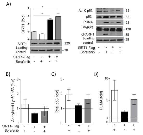 SIRT1 overexpression, however, counteracted polymerase 1 (PARP-1) cleavage (Figure 6A), indicating an anti-apoptotic action. In line with this, deacetylation of p53 was increased in SIRT1-overexpressing cells (Figure 6A,B), and total p53 levels were reduced (Figure 6A,C). The expression of the pro-apoptotic factor p53 upregulated modulator of apoptosis (PUMA) is regulated by p53 [] and was found to be slightly decreased in sorafenib-treated SIRT1 overexpressing cells compared with vector-transfected cells (Figure 6A,D). The p53-PUMA pathway could, therefore, be involved in the anti-apoptotic effect induced by SIRT1.