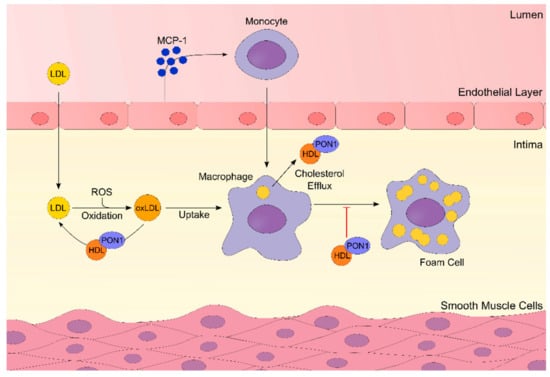 Atherosclerosis is a lipid-driven chronic inflammatory disease that is caused by the combination of lipid accumulation and immune cells within the atherosclerotic plaque [104]. A key early step in the development of atherosclerosis is the oxidation of serum LDL. The oxidized products are scavenged by macrophages that may transform into foam cells (Figure 1). These will then become fatty streaks in the endothelium, and then form atheromatous plaques [105]. Studies on animal models have demonstrated that overexpression of PON1 leads to an increased resistance to inflammation and atherosclerosis [106], whereas PON1 knockout mice are more susceptible to lipoprotein oxidation and increased inflammation [107]. Moreover, macrophages of PON1 knockout mice present decreased glutathione concentrations and increased oxidative stress markers and [108], which result in increased oxLDL and foam cell formation [109]. One of the first events of plaque formation is the upregulation of MCP-1 secretion by oxLDL. PON1 inhibits the secretion of MCP-1 in several ways: inhibits its secretion from endothelial cells; and, prevents LDL-derived oxidized phospholipid formation, which is known to stimulate adhesion of monocytes to the endothelial cells and MCP-1 production [110]. Moreover, the formation of lysophosphatidylcholine induced by the HDL-associated PON1 hydrolytic action on macrophage phospholipids enhances HDL binding to macrophages, and consequently enhances cholesterol efflux [111] (Figure 1).
