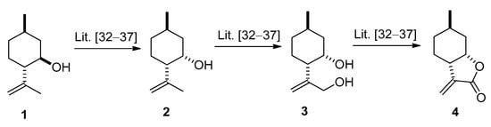 The key intermediate (−)-α-methylene-γ-butyrolactone 4 was prepared from commercially available (−)-isopulegol 1 by oxidizing its hydroxy group, followed by stereoselective reduction of the resulting carbonyl group providing (+)-neoisopulegol 2. Regioselective allylic hydroxylation of 2 gave diol 3, which was transformed to 4 by oxidation and ring closure of the obtained γ-hydroxy-substituted α,β-unsaturated carboxylic acid applying literature methods [,,,,,] (Figure 1).