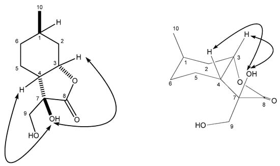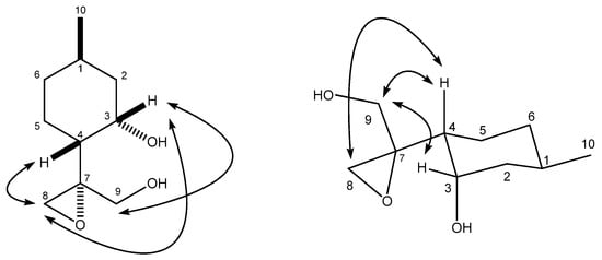 Stereospecific epoxidation of allylic diol 3 with t-BuOOH and VO(acac)2 was successfully applied to prepare epoxy diol 31 [,,] (Scheme 3). The relative configuration of epoxide 31 was determined by means of NOESY experiments. Significant NOE signals were shown between the H-8 and H-3, H-4 as well as the H-3 and H-9 protons (Figure 4).