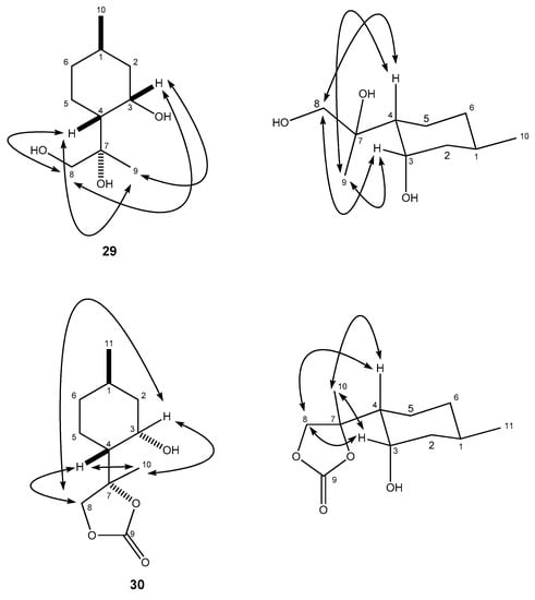 The structure of compound 29 was confirmed by its five-membered cyclic carbonate 30 synthesized from 29 by the reaction with triphosgene (Scheme 2) []. It is well known that this carbonation reaction maintains the stereochemical configuration of 29 [,]. The stereochemical structure of carbonate 30 was identified by NOESY analyses: characteristic NOE signals were observed between the protons H-8 and H-3, H-4 together with the protons H-10 and H-3, H-4 (Figure 3).