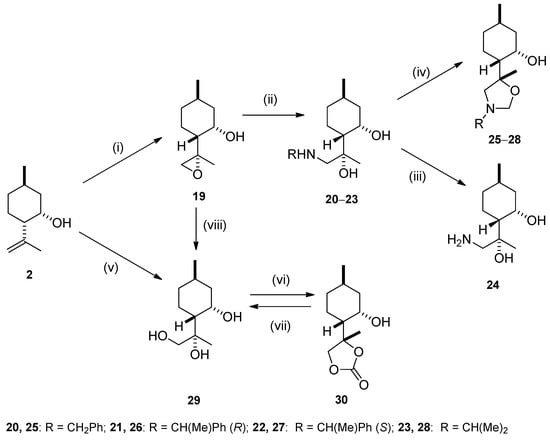 Monoterpene-based diols or triols have also proved to be good chiral auxiliaries and catalysts [,]. They also possess marked biological properties; e.g., antimicrobial, antifungal or enzyme inhibitor activities [,,].