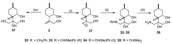 The oxirane ring of 31 was opened with primary amines and LiClO4 as catalyst to give aminotriol library 32–35 [,]. Primary aminotriol 36 was obtained by debenzylation of the corresponding aminotriols 32–34 under standard condition by hydrogenation in the presence of a Pd/C catalyst. The synthesis of tetraol 37 was effectively performed by selective dihydroxylation of compound 3 with the OsO4/NMO system [,] (Scheme 3).