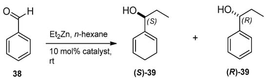 Aminodiol derivatives 9–17 and 20–28 together with aminotriols 32–36 were applied as chiral catalysts in the enantioselective addition of diethylzinc to benzaldehyde 38 to form (S)- and (R)-1-phenyl-1-propanol 39 (Scheme 4).