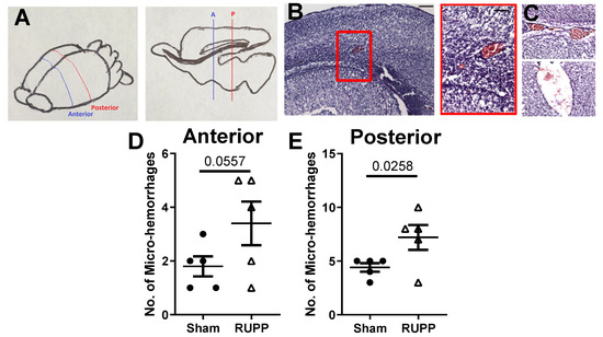 We counted the number of micro-bleeds and found significantly higher numbers of micro-hemorrhages in the brains of fetuses exposed to placental ischemia in the posterior sections, and a trend for increased micro-bleeds in the anterior slices of the brain. In the anterior slices, RUPP-exposed fetuses had 3.4 ± 0.8 bleeds compared to the sham-exposed (1.8 ± 0.4 bleeds; p = 0.056; Figure 2D). In the posterior slices, sham-exposed fetuses had 4 ± 1 while RUPP-exposed fetuses had 7 ± 1 bleeds (p = 0.026, Figure 2E). Thus, exposure to placental ischemia almost doubled the incidence of fetal brain micro-bleeds in utero.