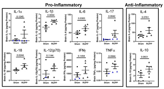 Maternal inflammation and cerebral micro-bleeds are associated with increases in neuroinflammation. Therefore, we assessed the levels of different cytokines/chemokines in brain homogenates of exposed fetuses. We found increases in the pro-inflammatory cytokines, IL-1β, IL-6, and IL-18, and a trend for increased levels of TNFα and IL-17 in brains of fetuses exposed to placental ischemia. Additionally, IL-10 and IL-4 levels tended to increase in brains of fetuses exposed to placental ischemia. Those data suggest two possibilities. The first possibility is that there is an increased transfer of maternal inflammatory factors across the placental barrier into the fetal circulation. This is plausible since preeclampsia patients have increased circulating levels of tumor necrosis factor alpha (TNFα) [20], interleukin (IL)-2 [37,38], IL-6 [21], and IL-17 [39,40,41]. Placental ischemic rats also have increased levels of inflammatory cytokines in the circulation and cerebrospinal fluid [20,21,27,42,43]. We have not assessed changes in placental barrier permeability in the RUPP model of placental ischemia, and this is an area of ongoing investigation. The second possibility is that there is increased local production of these cytokines in the fetal brains following exposure to placental ischemia.