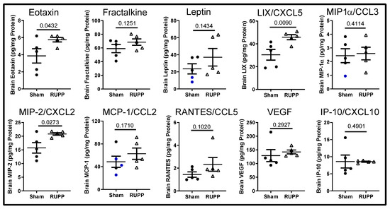 Changes in chemokines/growth factors in fetal brains. Placental ischemia exposure increased eotaxin, LIX, and MIP2 levels. Not shown are: EGF, G-CSF, GM-CSF, and GRO/KC. Blue points represent extrapolated values (one value below lowest detectable value and normalized to protein concentration). Values for individual fetuses (n = 5 fetuses per group) are shown along with the mean ± SEM. Data were analyzed using unpaired t-tests, and p-values are indicated.