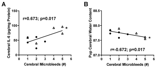 Because micro-hemorrhages are associated with a pro-inflammatory environment [29], we performed correlations to identify whether any factors were strongly associated with the number of micro-bleeds observed. Comparing fetuses from the same dam, we found that cerebral tissue IL-6 levels were positively associated with the number of micro-bleeds detected (Figure 5A; r = 0.673; p = 0.017). Surprisingly, although there were no differences in brain water content between the groups, fetal brain water content was negatively associated with the number of micro-bleeds (Figure 5B; r = −0.672; p = 0.017).