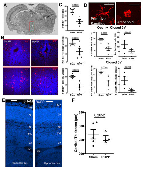 Microglia are key producers of cytokines in the brain, so we assessed changes in microglial density and morphology in the brains of exposed fetuses. As reviewed in [30], microglia migrate from the ventricles and meninges during development, making the sub-ventricular zone (SVZ) the ideal region to quantify changes in microglial density. Representative images of a brain section and the third ventricle from sham and placental ischemia-exposed fetuses are shown in Figure 6A, B. We found fewer Iba1 + cells in the SVZ of the third ventricle (40 ± 3 in shams versus 19 ± 4; p = 0.003), and this reduction was observed both in the open (23 ± 2 in sham versus 13 ± 4; p = 0.036) and closed (21 ± 1 in shams versus 9 ± 2; p = 0.005) portion of the third ventricle (Figure 6C). We further characterized the microglia based on morphology into primitive ramified or amoeboid microglia [31] (Figure 6D) and counted these separately. We found a significant decrease in primitive ramified microglia in fetuses exposed to RUPP (13 ± 4 versus 28 ± 2 in Sham, p = 0.007; Figure 6D) and no change in the number of amoeboid microglia (13 ± 4 in Sham versus 5 ± 2 in RUPP, p = 0.089). We found no significant difference in cortical plate thickness (a potential indicator of neuronal density) between the fetuses exposed to normal or placental ischemic pregnancies (Figure 6E,F).