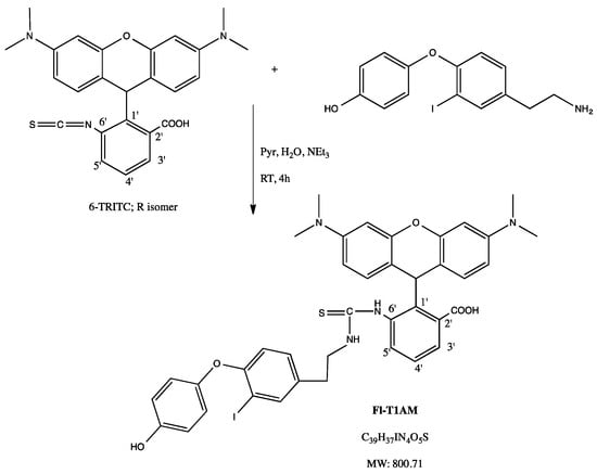 The specific mechanism of T1AM entry into the cell, as well as its internal target or areas of compartmentalization, remains unknown. To address these aspects, a fluoro-labeled version of T1AM (FL-T1AM) was synthesized by conjugating T1AM to rhodamine, previously shown to be effective in creating fluoro-conjugates of thyroid hormone derivatives [,], and further utilized in our lab to successfully image T1AM in cancer cells []. Briefly, rhodamine-labeled T1AM was obtained by combining a 1:1 molar ratio of TRITC and T1AM in 0.1 mL pyridine (Pyr):water (H2O):triethylamine (NEt3) (9:1.5:0.1, v/v/v) mixture with stirring for 4 h at room temperature in the dark (Figure 1). The crude product was first purified by flash column chromatography (Hexanes/IPA 2:1) in dark conditions to separate the conjugated and unconjugated forms of T1AM. The desired product was then eluted by 100% methanol wash. Methanol was dried and the dried sample was kept at −20 °C. The powdered residue was reconstituted into a working dilution with DMSO prior to its use.