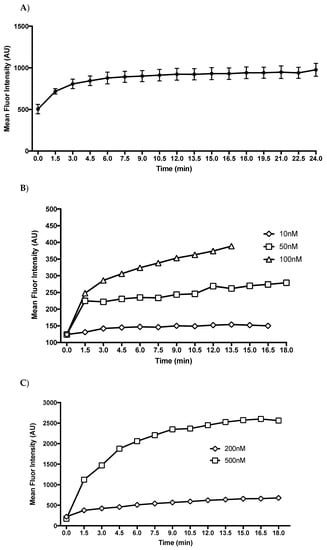 Uptake rate of fluorescent labeled T1AM (FL-T1AM). 3T3-L1 cells were given FL-T1AM and their mean shift in fluorescent intensity was measured with 10,000 cells per time point. T1AM uptake appears to involve a three-phase pattern, consisting of a rapid exponential uptake, followed by a linear steady increase, and ending with a plateau. (A) Mean fluorescent shift of FL-T1AM signal at 100 nM ± SEM. (B) Fluorescent signal intensity over time at 10, 50, and 100 nM. (C) Fluorescent signal intensity over time at 200 nM and 500 nM.