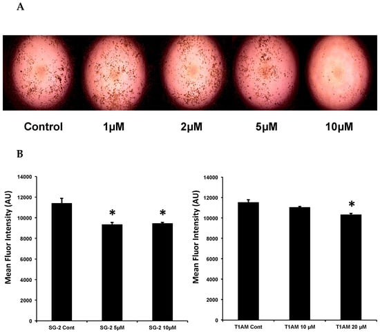 Treatment with T1AM or SG-2 at 10 and 25 µM did not significantly cause cell death with respect to control cells (Figure 6C), in agreement with the results from our previous investigations that showed cell viability only started to decrease at 60 µM for SG2 and 125 µM for T1AM in HepG2 cells [].