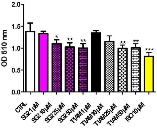 Effects of T1AM and SG-2 on lipid accumulation in fully differentiated 3T3-L1 cells. Mature adipocytes were treated for 24 h with T1AM or SG-2 (1, 10, 25, 50 µM). 10 µM isoproterenol (ISO) was used as positive control. Oil red O stained intercellular oil droplets were eluted with isopropanol and quantified by spectrophotometry analysis at 510 nm. Values represent the mean ± SEM of 4–8 experiments. The groups were compared using the One-Way ANOVA followed by Tukey’s range test. * p < 0.05; ** p < 0.01; *** p < 0.005.