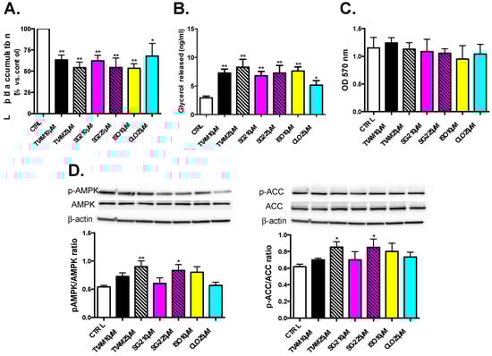 After treatment with test compounds, cell culture supernatants were collected from each well and placed in glycerol-free containers. A 125 μg/mL glycerol standard solution (Abcam, Milan, Italy) was used to make a #1 through #8 standard curve. Twenty-five microliters of each supernatant and standard were then transferred into a 96-well plate and 100 μL of either Free Glycerol Assay Reagent (Abcam, Milan, Italy) or MilliQ water added to each well. After incubation at RT for 15 min, glycerol levels were measured by reading absorbance at 540 nm (Bio-Rad 680, Milan, Italy).