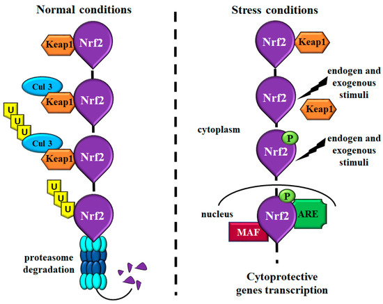 Schematic representation showing the main Nrf2 molecular mechanisms. Under normal condition, Nrf2 binds its inhibitor Keap1 that mediates the interaction with Cul3 leading to Nrf2 ubiquitination and proteasome degradation. These events provide a regulated modulation of Nrf2 levels in the cells. Under stress conditions and in response to different insults, Keap1 is inactivated, and Nrf2 is phosphorylated and translocated into the nucleus. In the nucleus, Nrf2 binds MAF proteins and, consequently, ARE sequences inducing the transcription of cytoprotective genes. Abbreviations: Cul3 = Cul3-based E3-ubiquitin ligase; Keap1 = Kelch-like ECH-associated protein 1; Nrf2 = nuclear factor-erythroid 2-related factor; MAF = musculoaponeurotic fibrosarcoma proteins; ARE = antioxidant responsive element; P = phosphorylated.