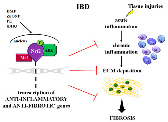 Schematic representation of the role of Nrf2 in intestinal inflammation and fibrosis occurring in inflammatory bowel disease (IBD). After tissue injuries, the cell’s response is characterized by a cascade of events: acute inflammation, chronic inflammation, and ECM proteins deposition leading to fibrosis. In these pathological events, Nrf2 is activated and then induces the transcription of the anti-inflammatory and antifibrotic genes. Molecules such as DMF, ZnONP, PE, and tBHQ, improving Nrf2 signaling, could be a new therapeutic strategy for intestinal inflammation and fibrosis. Abbreviations: ECM = extracellular matrix; Nrf2 = muclear factor-erythroid 2-related factor; Maf = musculoaponeurotic fibrosarcoma proteins; ARE = antioxidant responsive element; P = phosphorylated; DMF = dimethyl fumarate; ZnONP = ZnO nanoparticle; PE = Perilla frutescens; tBHQ = tert-butylhydroquinone.