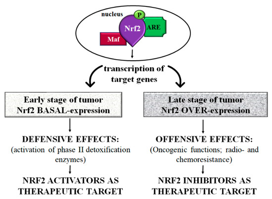 On the one hand, in an early stage of the disease, Nrf2 exerts a protective role against chemical-induced carcinogenesis through its ability to reduce ROS accumulation and, consequently, DNA injuries in cells [12,91,92,93,94,95] (Table 3). On the other hand, in the late stage of tumor progression, there is what is called “the dark side” of Nrf2, since it seems to be involved in cancer proliferation, and in chemo- and radioresistance [13,14,17,96,97,98,99,100,101,102] (Table 3).