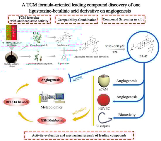There is a need for an efficient and low-cost leading compound discovery mode. However, drug development remains slow, expensive, and risky. Here, this manuscript proposes a leading compound discovery strategy based on a combination of traditional Chinese medicine (TCM) formulae and pharmacochemistry, using a ligustrazine–betulinic acid derivative (BA-12) in the treatment of angiogenesis as an example. Blocking angiogenesis to inhibit the growth and metastasis of solid tumors is currently one recognized therapy for cancer in the clinic. Firstly, based on a traditional Prunella vulgaris plaster, BA-12 was synthesized according to our previous study, as it exhibited better antitumor activities than other derivatives on human bladder carcinoma cells (T24); it was then uploaded for target prediction. Secondly, the efficacy and biotoxicity of BA-12 on angiogenesis were evaluated using human umbilical vein endothelial cells (HUVECs), a quail chick chorioallantoic membrane, and Caenorhabditis elegans. According to the prediction results, the main mechanisms of BA-12 were metabolic pathways. Thus, multiple metabolomics approaches were applied to reveal the mechanisms of BA-12. Finally, the predictive mechanisms of BA-12 on glutathione metabolism and glycerophospholipid metabolism activation were validated using targeted metabolomics and pharmacological assays. This strategy may provide a reference for highly efficient drug discovery, with the aim of sharing TCM wisdom for unmet clinical needs.
