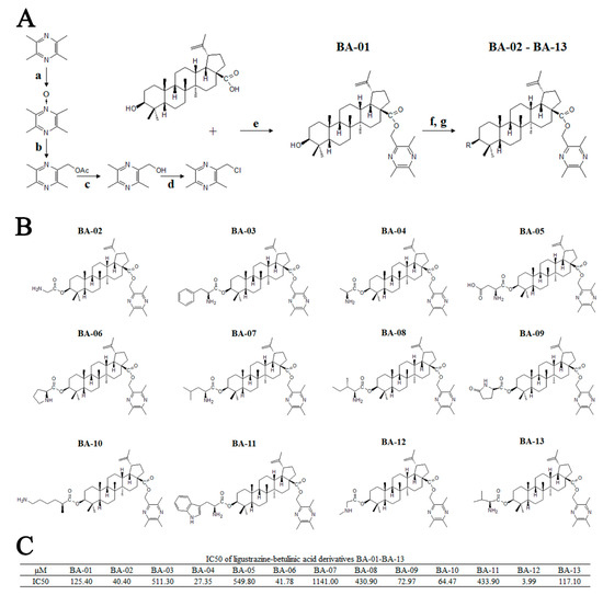 Synthesis, chemical information, and antitumor activities of ligustrazine–betulinic acid derivatives (BA-01–BA-13) on human bladder carcinoma (T24) cells. (A) Synthesis of ligustrazine–betulinic acid derivatives (BA-01–BA-13). Conditions and reagents: (a) acetic acid and 30% H2O2, reflux at 90 °C for 6 h; (b) acetic anhydride, reflux at 105 °C for 2 h; (c) methanol (MeOH):tetrahydrofuran (THF):H2O ¼ 1:3:1 with NaOH for 1 h; (d) tosyl chloride (TsCl), THF, 4-dimethylaminopyridine (DMAP), trimethylamine (TEA) for 12 h; (e) dry K2CO3, dry N,N-dimethylformamide (DMF) at 25 °C for 12 h; (f) N-benzyloxycarbonyl (N-Cbz) or N-butyloxy carbonyl (N-Boc) amino acids, DMAP, 1-ethyl-3-(3-dimethylaminopropyl)carbodiimide hydrochloride (EDCI), dichloromethane (DCM) at 25 °C for 12 h; (g) Pd/C (10%), MeOH at 25°C for 12 h, or trifluoroacetic acid (TFA) in dry DCM at 0 °C for 2 h. (B) Structures of ligustrazine–betulinic acid derivatives (BA-01–BA-13). (C) Half maximal inhibitory concentration (IC50) values of ligustrazine–betulinic acid derivatives (BA-01–BA-13) on T24 cells, evaluated using 3-(4,5-dimethylthiazol-2-yl)-2,5-diphenyltetrazolium bromide (MTT) assays.