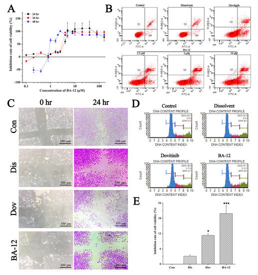 Among these, BA-12 exhibited better antitumor activities as indicated by a significant (p < 0.05) increase in apoptosis, and a significant (p < 0.05) decrease in proliferation and migration of T24 cells (Figure 3). A certain dose (2.5 μM) of dovitinib was set as a positive control in this part of our experiment [28,29]. The MTT assay showed the effect of BA-12 on T24 cells (Figure 3A). Then, the effects of BA-12 on apoptosis in T24 cells were further determined by flow cytometric analysis (Figure 3B and Table 1). The apoptosis ratios increased to 20.3% (2.5 μM), 31.0% (5 μM), and 33.3% (10 μM), while that of the control was 5.7%, indicating that BA-12 could induce T24 cell apoptosis in a concentration-dependent manner. Thus, 2.5 μM BA-12 was chosen for subsequent studies. As the data show, 2.5 μM BA-12 could significantly (p < 0.05) inhibit cell viability, scratch healing percentage, and cell cycle compared to the dissolvent group (Figure 4C–E and Table 1). These results revealed the significant (p < 0.05) inhibitory effect of BA-12 on T24 cells.