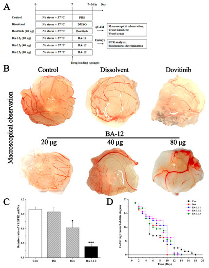 The effect of BA-12 on angiogenesis using a quail chick chorioallantoic membrane (qCAM) and human umbilical vein endothelial cells (HUVECs), and its biotoxicity based on a survival essay with Caenorhabditis elegans. (A) Schematic diagram of the experimental design. Con, control group treated with phosphate-buffered saline (PBS); Dis, dissolvent group treated with dissolvent containing 0.5% dimethyl sulfoxide (DMSO); Pos, positive control group treated with dovitinib (40 μg); BA-12 1–3, groups treated with BA-12 at doses of 20, 40, and 80 μg, respectively. (B) Inhibition of angiogenesis by BA-12 for qCAM assays in a dose-dependent manner. (C) Messenger RNA (mRNA) levels of vascular endothelial growth factor receptor 2 (VEGFR2) in qCAM samples. The most representative fields are shown. (D) Survival assay using Caenorhabditis elegans for biotoxicity detection. ANOVA with a post hoc test was used to calculate the significance of the differences; * p < 0.05, *** p < 0.001 compared with the dissolvent group. Experiments were executed three times. Results are displayed as means ± SD.