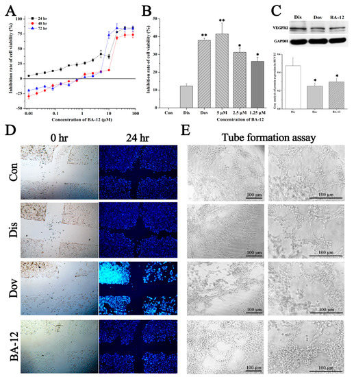 The effect of BA-12 on angiogenesis in HUVECs. (A) Inhibition rate of cell viability of HUVECs by MTT assays (cells treated with BA-12 at doses of 0.25–160 μM) for 24, 48, and 72 h. (B) Inhibition rate of cell viability of HUVECs for MTT assays for 24 h. (C) Cellular VEGFR levels and grayscale analysis. (D,E) Results for wound scratch assay and tube formation assay after 24 h under the microscope (100×). Con, control group treated with PBS; Dis, dissolvent group treated with dissolvent containing 0.5% DMSO; Pos, positive control group treated with dovitinib (2.5 μM); BA-12, groups treated with BA-12 at doses of 2.5 μM. Representative fields are shown. ANOVA with a post hoc test was applied for the significance of the differences; * p < 0.05, ** p < 0.01 compared with the dissolvent group. Experiments were executed three times. Results are displayed as means ± SD.