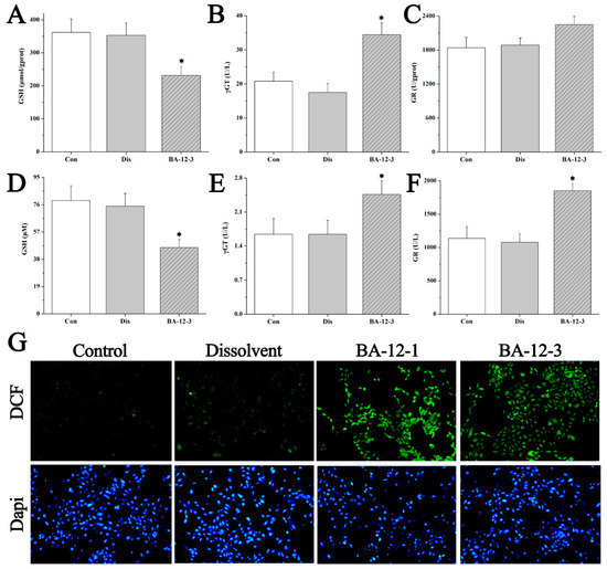 Mechanisms of BA-12 for glutathione (GSH) metabolism activation. (A–C) GSH, γ-glutamyl transferase (γGT), and glutathione reductase (GR) levels in quail samples, respectively. (D–F) GSH, γGT, and GR levels in cell samples, respectively. (G) Morphological observation and relative fluorescence intensity of HUVECs induced by BA-12 (10, 2.5 μM) for 24 h by reactive oxygen species (ROS) assay and 4′,6-diamidino-2-phenylindole (DAPI) staining under the fluorescence microscope (100×). Dichlorofluorescein (DCF), compounds with fluorescence for the reflection of ROS levels. The most representative fields are shown. Con, control group treated with PBS; Dis, dissolvent group treated with dissolvent containing 0.5% DMSO; BA-12-1 and BA-12-3, groups treated with BA-12 at doses of 5 and 1.625 μg, respectively. ANOVA with a post hoc test was applied for the significance of the differences; * p < 0.05 compared with the dissolvent group. Experiments were executed three times. Results are displayed as means ± SD.