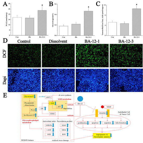 Mechanisms of BA-12 for glycerophospholipid metabolism activation. (A–C) Phospholipase A2 (PLA2), glycerol, and non-esterified free fatty acid (NEFA) levels in quail samples, respectively. (D) Morphological observation and relative fluorescence intensity of T24 cells induced by BA-12 for 24 h by ROS assay and DAPI staining under the fluorescence microscope (100×). DCF, compounds with fluorescence for the reflection of ROS levels. The most representative fields are shown. (E) Schematic diagram of the efficacy and mechanism of BA-12 for angiogenesis. Con, control group treated with PBS; Dis, dissolvent group treated with dissolvent containing 0.5% DMSO; BA-12-1 and BA-12-3, groups treated with BA-12 at doses of 5 and 1.625 μg, respectively. ANOVA with a post hoc test was applied for the significance of the differences; * p < 0.05 compared with the dissolvent group. Experiments were executed three times. Results are displayed as means ± SD.