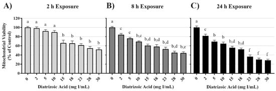 Diatrizoic acid cytotoxic effects on mitochondrial viability in HK-2 cells using 3-(4,5-dimethylthiazol-2-yl)-2,5-diphenyltetrazolium bromide (MTT). Diatrizoic acid (DA) diminished mitochondrial viability at 2 h (A), 8 h (B), and 24 h (C). Different letters (a–f) above each bar indicate statistical difference (p < 0.05) between all treatments compared across all time points (2, 8, and 24 h). Values represent mean ± SEM for three independent experiments.