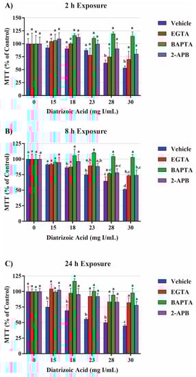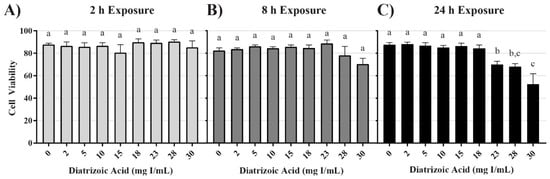 Diatrizoic acid cytotoxic effects on cell viability in HK-2 cells using trypan blue exclusion. DA diminished cell viability at 24 h (C) but not at 2 h (A) or 8 h (B). Different letters (a–c) above each bar indicate statistical difference (p < 0.05) when comparing all DA concentrations across all time points. Values represent mean ± SEM for three independent experiments.
